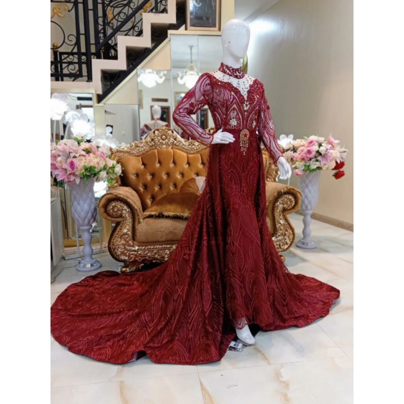 Songket penuh ni bukan buat baju kebaya macam dolu dolu yaya buat dress dari atas ke bawah with heavy beads dan lace berwarna keemasan di . Ekor bisa dilepas terbaru di shopee. Gaun pengantin model sabrina warna maroon lengkap dengan slayer kerudung.